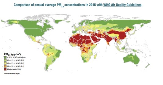 Siguiendo las pautas de la Organización Mundial de la Salud, el aire con baja contaminación es aquel con un promedio anual ponderado por población de concentración de PM2.5 hasta 10 µg/m3, pero el 92 por ciento de la población mundial habita en áreas que lo exceden, es decir que la mayoría de la población mundial convive con un aire insano (datos 2015).