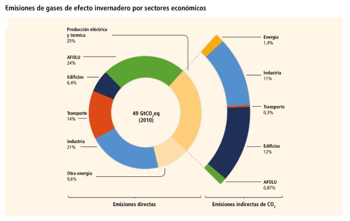 [1] Fuente: Quinto Informe de Evaluación del IPCC (2014): Grupo de trabajo III: Mitigación del Cambio Climático. Basado en las emisiones globales de 2010.