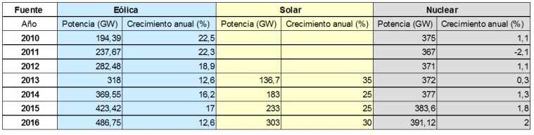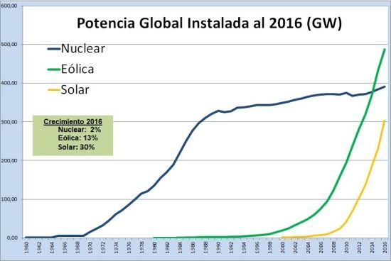 En los últimos 7 años, el crecimiento anual de las energías renovales no convencionales -eólica y solar fotovoltaica- ha estado, en promedio, en alrededor del 20 por ciento. Muy lejos de lo ofrecido por la industria nuclear. Por otro lado, ya en 2015, la capacidad instalada global de energía eólica superó a la de la nuclear, mientras se espera que en muy poco tiempo –debido al crecimiento acelerado de los últimos años- la solar también la supere.