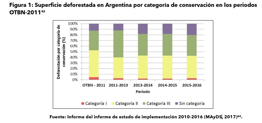 No es entonces casualidad que Argentina tenga uno de los once frentes más deforestados a nivel mundial[4]: la selva misionera y el Gran Chaco, el cual concentra el 60% de los bosques del país.[5] Esto ocurre aun cuando la tasa de deforestación anual se estabilizó en los últimos años en un 0,5%,[6] en especial porque la deforestación ilegal en zonas amarillas y rojas persiste (Figura 1).