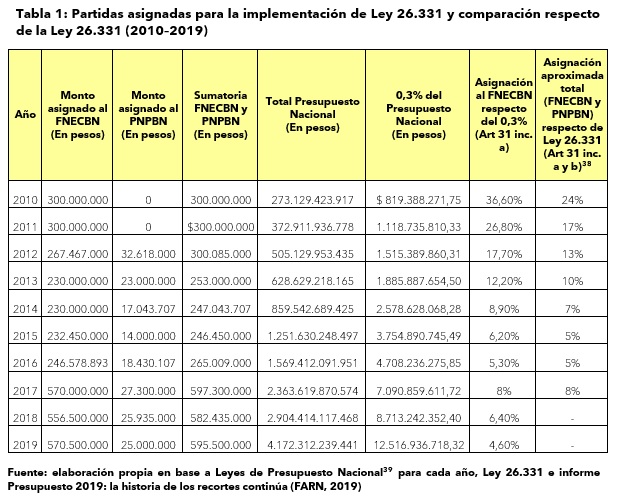 El Artículo 31 inciso a) de la Ley 26.331, sancionada por el propio Congreso, dispone que el 0,3% del presupuesto nacional debe ser asignado al Fondo Nacional para el Enriquecimiento y la Conservación de los Bosques Nativos (FNECBN). Como se muestra en la Tabla 1, nunca se asignó ni la mitad de ese 0,3% desde la reglamentación de la Ley en 2009. De hecho, esos porcentajes fueron cayendo estrepitosamente, alcanzando un 4,6% en 2019.